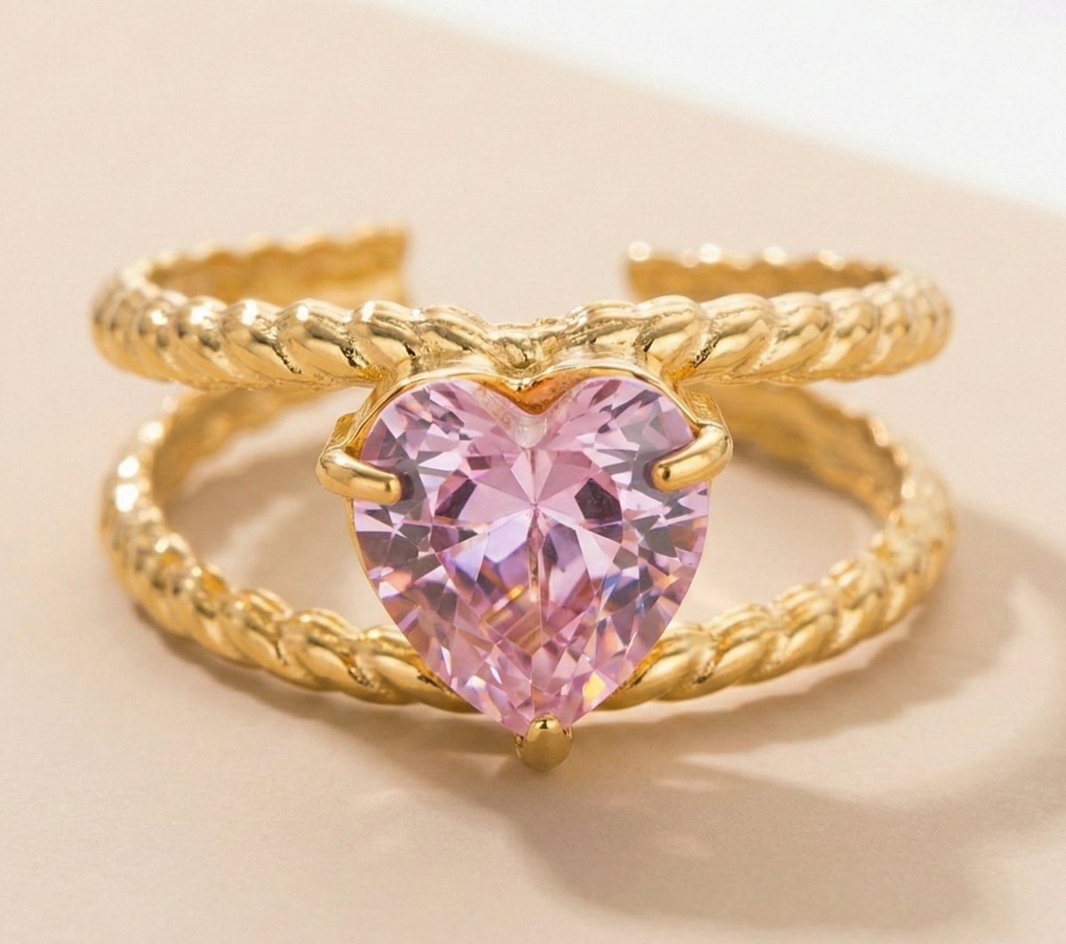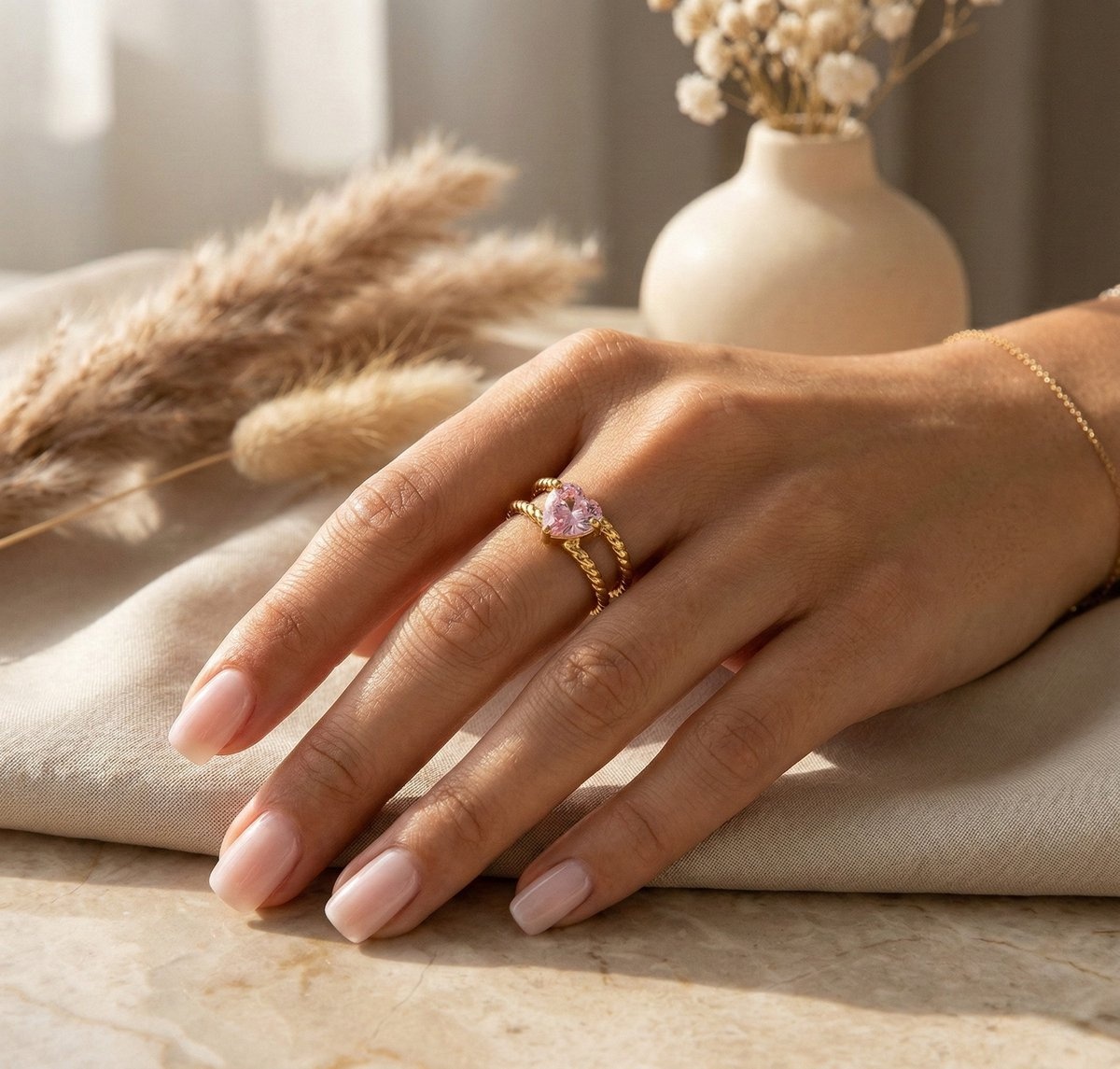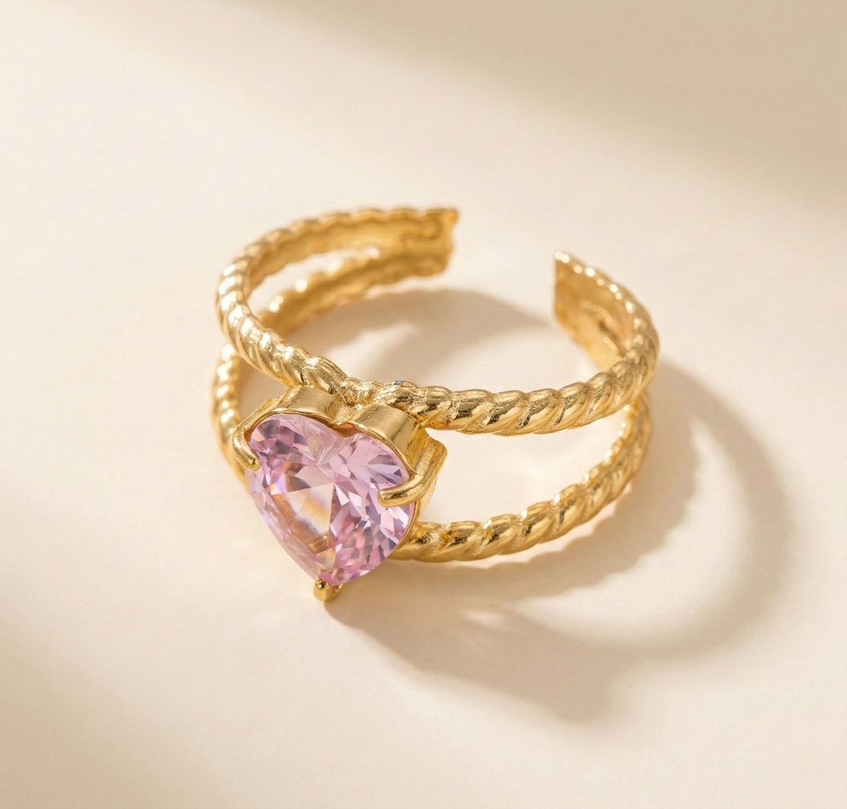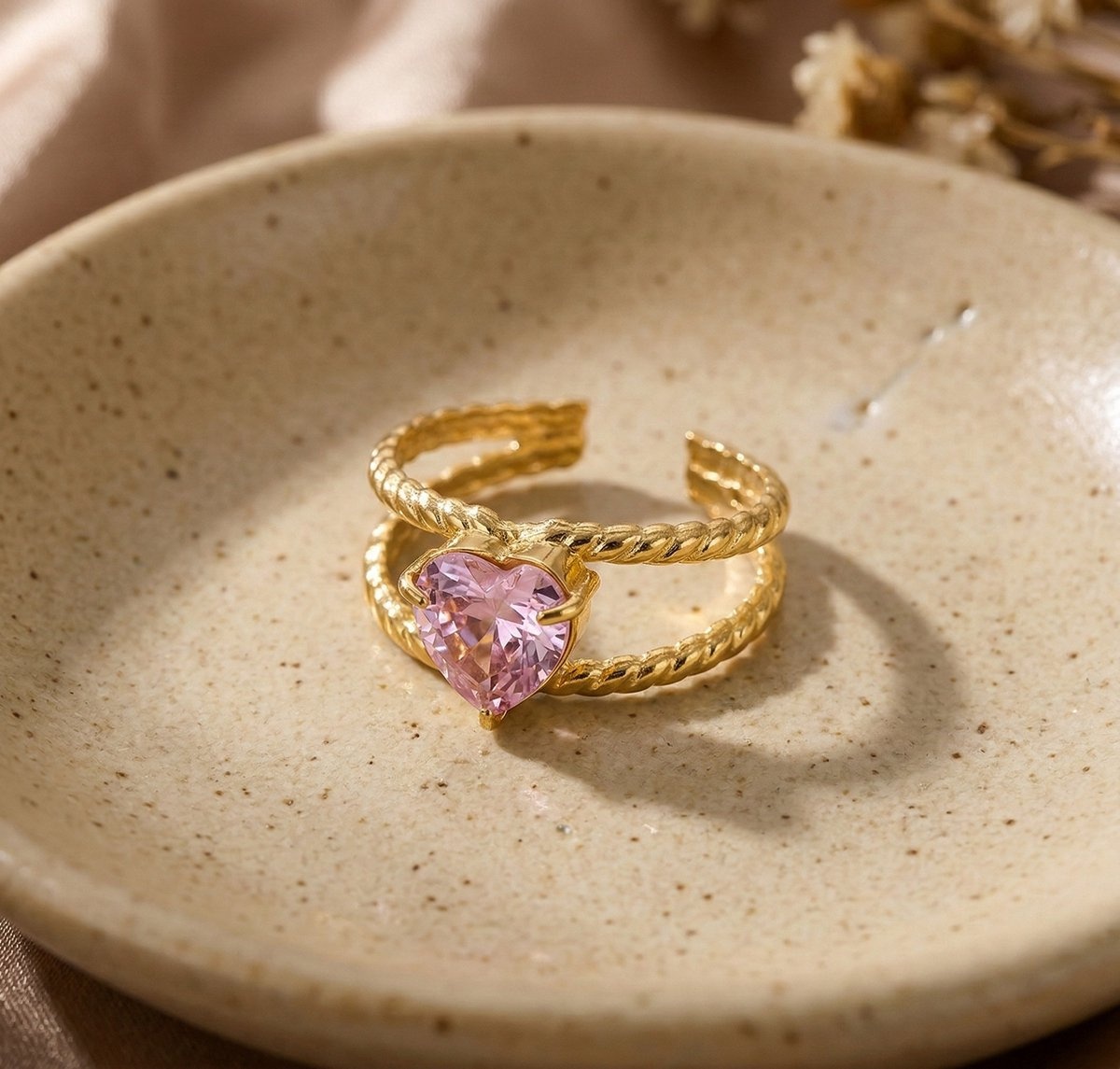 De Lundholm Francine ring is een elegante en romantische statement ring met een prachtige roze hartjessteen als middelpunt. De zachte roze tint in combinatie met de warme goudkleurige afwerking geeft deze ring een luxe en vrouwelijke uitstraling. Scandinavisch design met een liefdevolle, verfijnde touch.