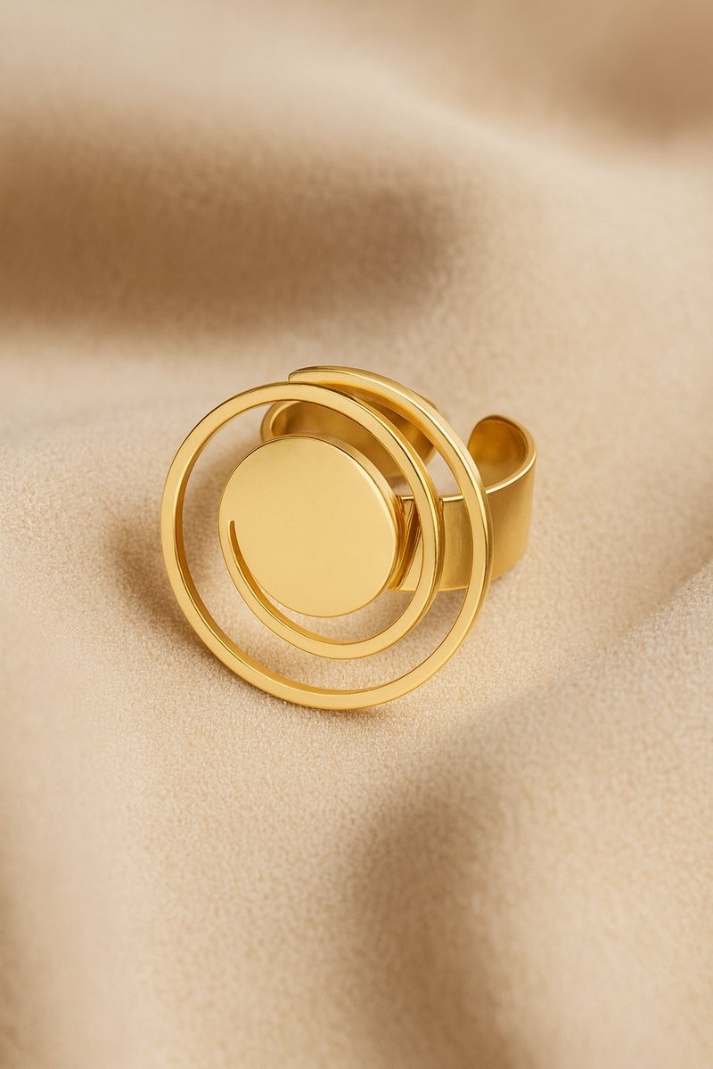 Een moderne blikvanger met architecturale vormen: deze goudkleurige statement ring is vervaardigd uit premium stainless steel met gold plated hoogglans. De open one-size band vormt zich prettig om de vinger en het grafische front met cirkelvormige ringen geeft elke outfit een high-end, sculpturale look.