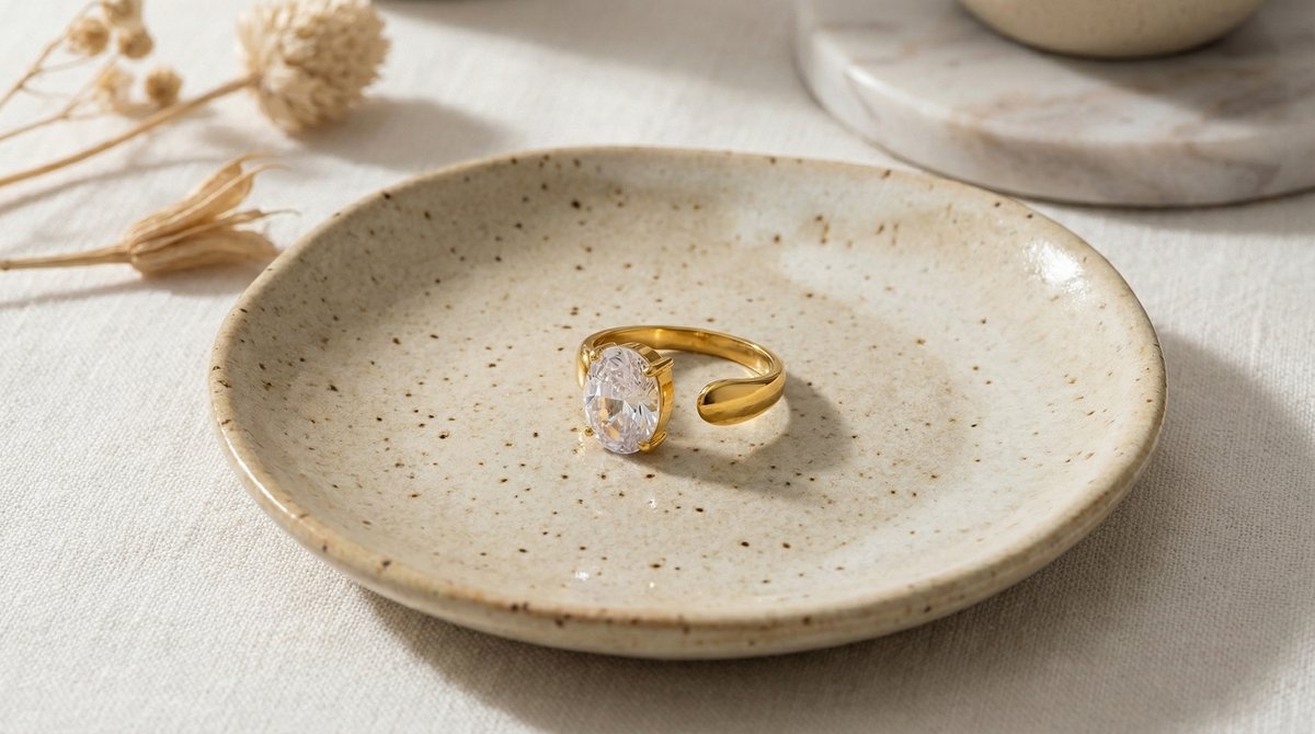 De ring is vervaardigd uit premium stainless steel en afgewerkt met een duurzame PVD gold plated coating. Deze hoogwaardige afwerking zorgt voor langdurige glans en uitstekende kleurvastheid. De Lenore ring is hypoallergeen, waterproof en geschikt voor dagelijks dragen.