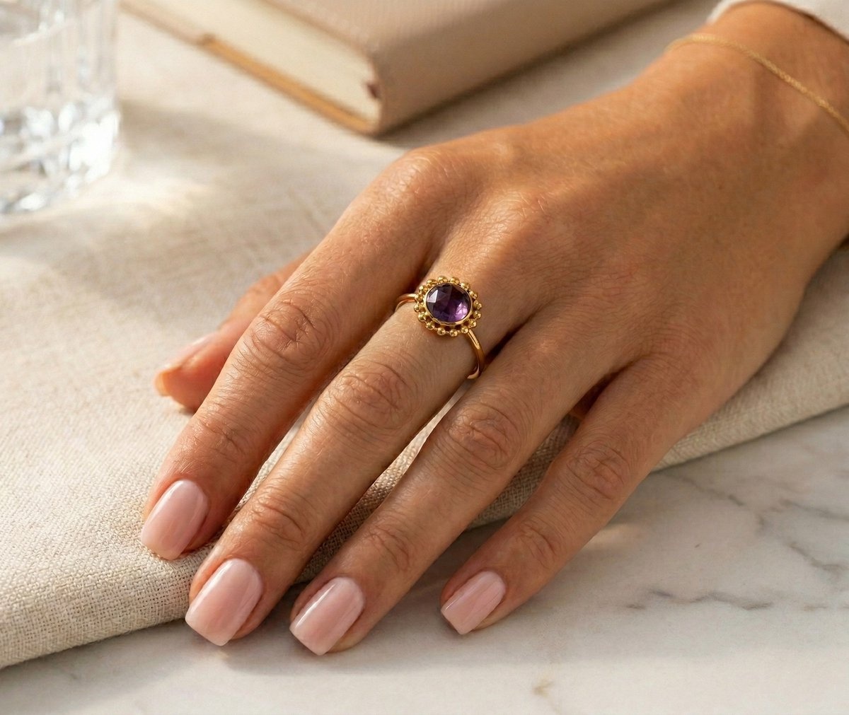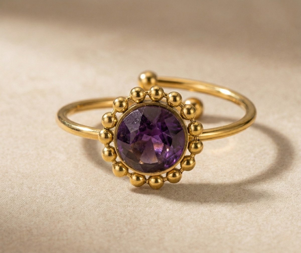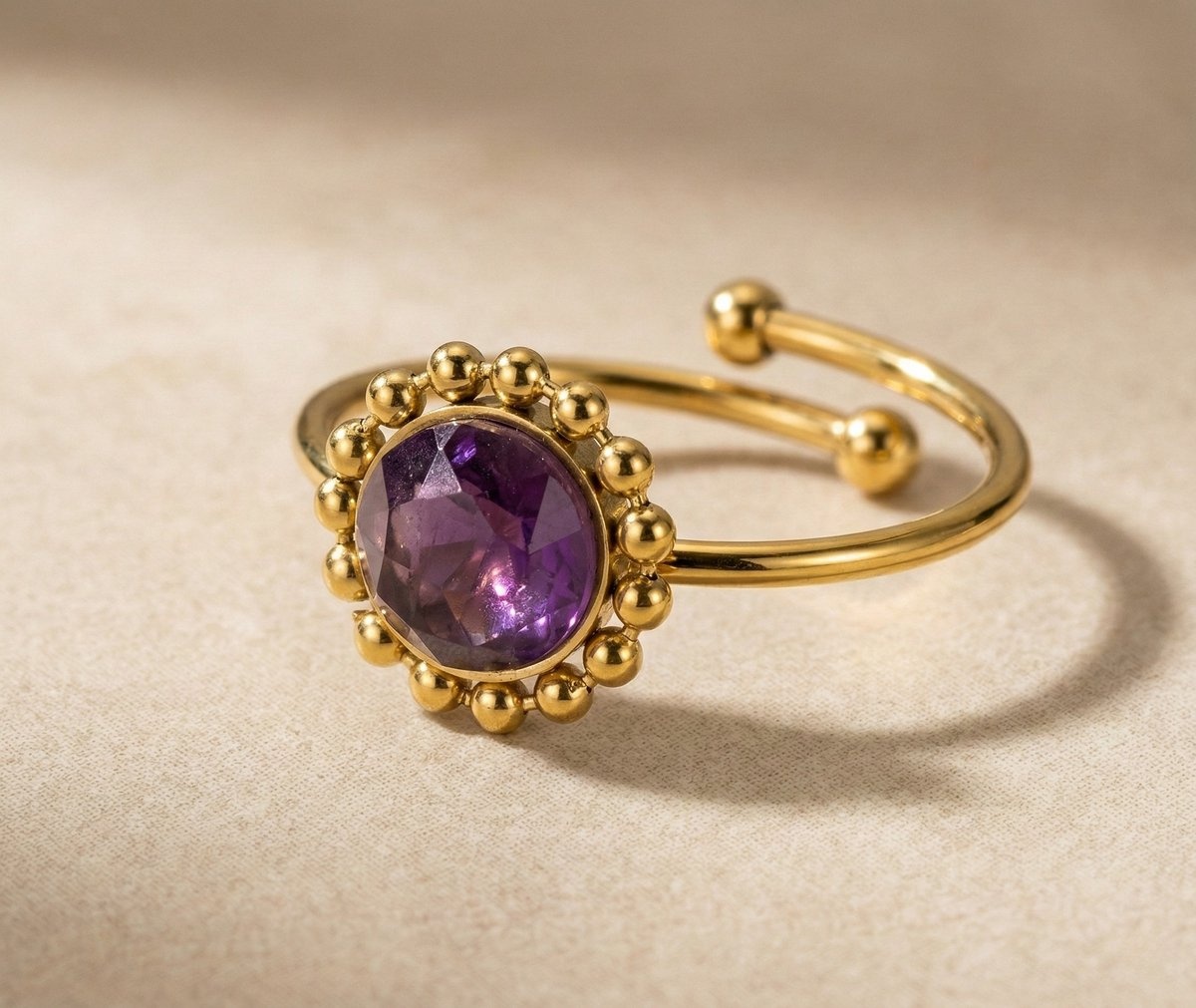 Paarse steen wordt vaak geassocieerd met creativiteit, intuïtie en innerlijke rust. De diepe paarse tint geeft het sieraad niet alleen een luxe uitstraling, maar voegt ook een gevoel van balans en verfijning toe.