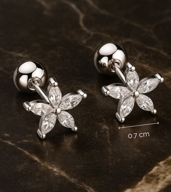 - Design: bloemvormige oorknopjes met zirkonia steentjes