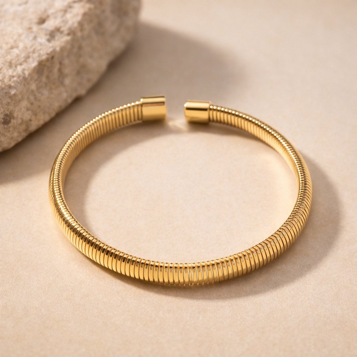 De armband is open aan de achterkant, wat hem geschikt maakt als one size dames armband. Het gladde, afgeronde design oogt modern en chic, zonder overdadig te zijn – perfect voor dagelijks dragen én speciale gelegenheden.