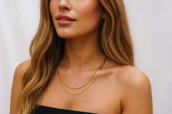 Lundholm Luxe Ketting Dames Dubbel Goudkleurig Waterproof – Premium Stainless Steel – 18K Goud Verguld – Dubbellaags (gevlochten & plat) – 45+5 cm – Scandinavisch Design – Cadeau voor Vrouw