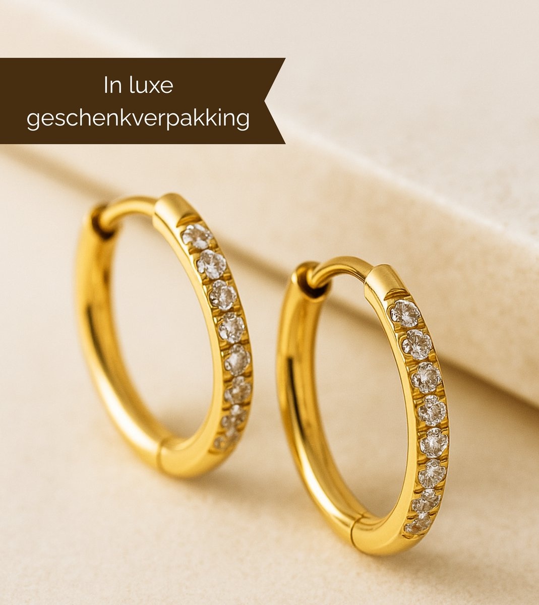 Lundholm Oorringen Dames – Premium Stainless Steel Gold PVD Plated – Hoops met Zirkonia Steentjes (Ø 18 mm) – Classy & Elegant – Waterproof & Hypoallergeen – Inclusief Luxe Geschenkverpakking