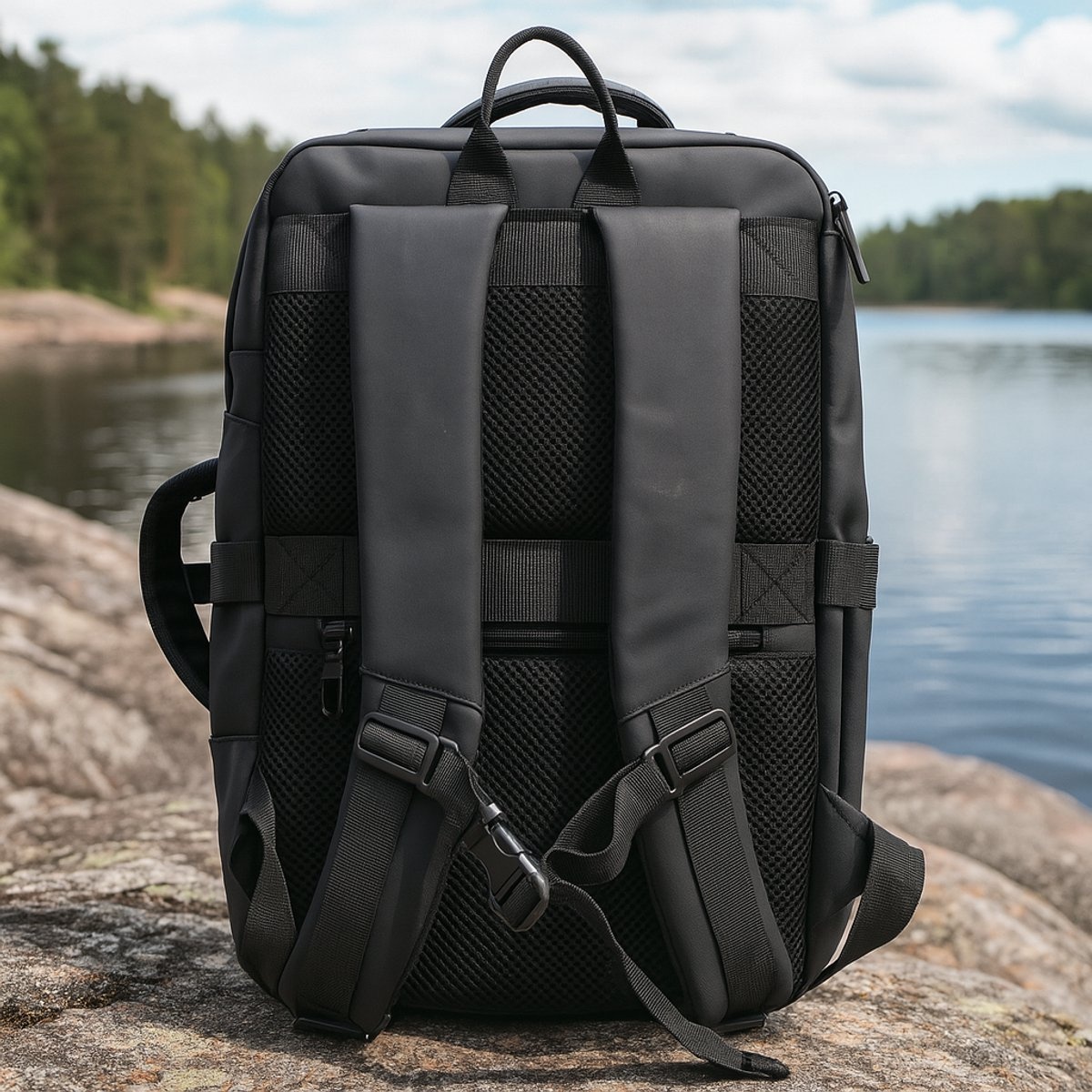 Deze luxe rugzak is ontworpen met oog voor detail en ultiem gebruiksgemak. Gemaakt van duurzaam, volledig waterdicht materiaal biedt de tas optimale bescherming tegen vocht. De ingenieuze indeling, geïnspireerd op een koffer, met gewatteerd 15.6 inch laptopvak achterin, ruime compartimenten en handige insteekvakken zorgt ervoor dat je alles georganiseerd kunt meenemen. De compressiebandjes aan de zijkanten laten je de tas eenvoudig strakker trekken voor een compacte pasvorm. Met een veiligheidsrits voor extra beveiliging, een speciaal vak voor je drinkwaterfles en meerdere ritsvakken is deze rugzak extra praktisch voor dagelijks gebruik of reizen. Dankzij de handbagage-vriendelijke afmetingen neem je hem moeiteloos mee in het vliegtuig.