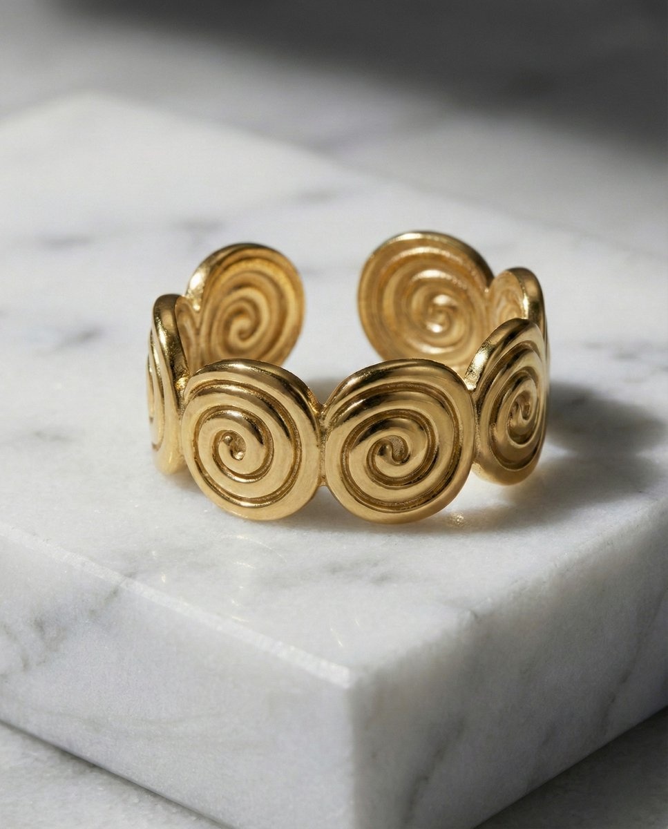 De Lundholm Merel ring is een luxe statement ring met een opvallend spiraaldesign. De ronde, organische vormen creëren een krachtige maar elegante uitstraling. Modern Scandinavisch design met karakter — een ring die direct in het oog springt.