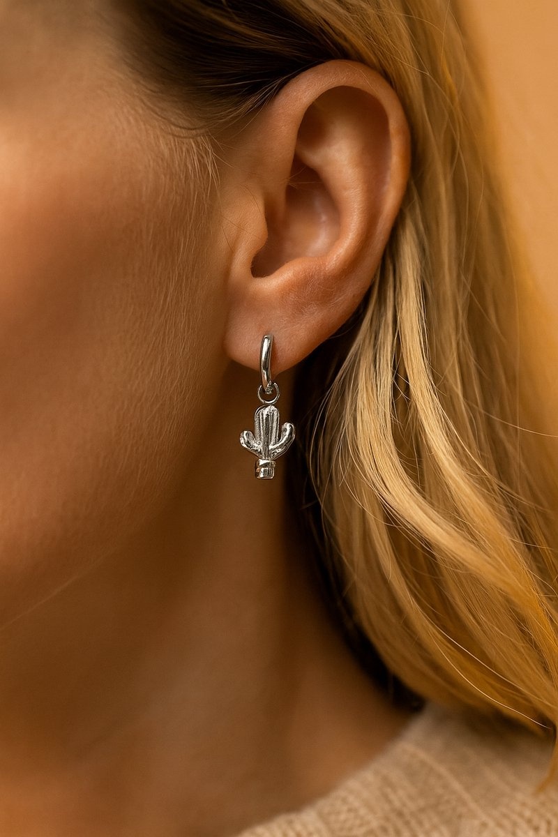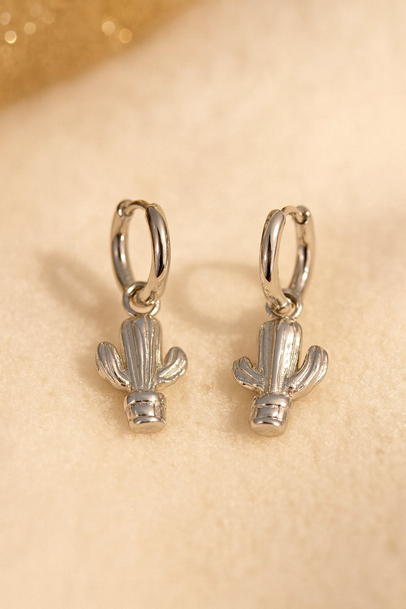 Voeg een speelse desert-touch toe met de Oasis oorringen. De slanke, zilverkleurige hoops zijn gemaakt van premium stainless steel en afgewerkt met een glanzende cactus hanger. Met 1,1 × 3,6 cm dragen ze licht en geven ze je look een frisse, moderne twist—van casual denim tot zomerjurk.