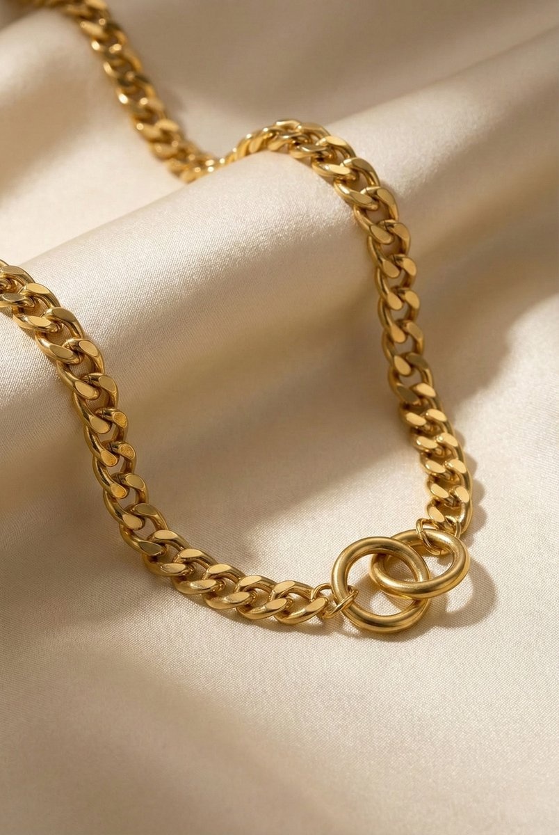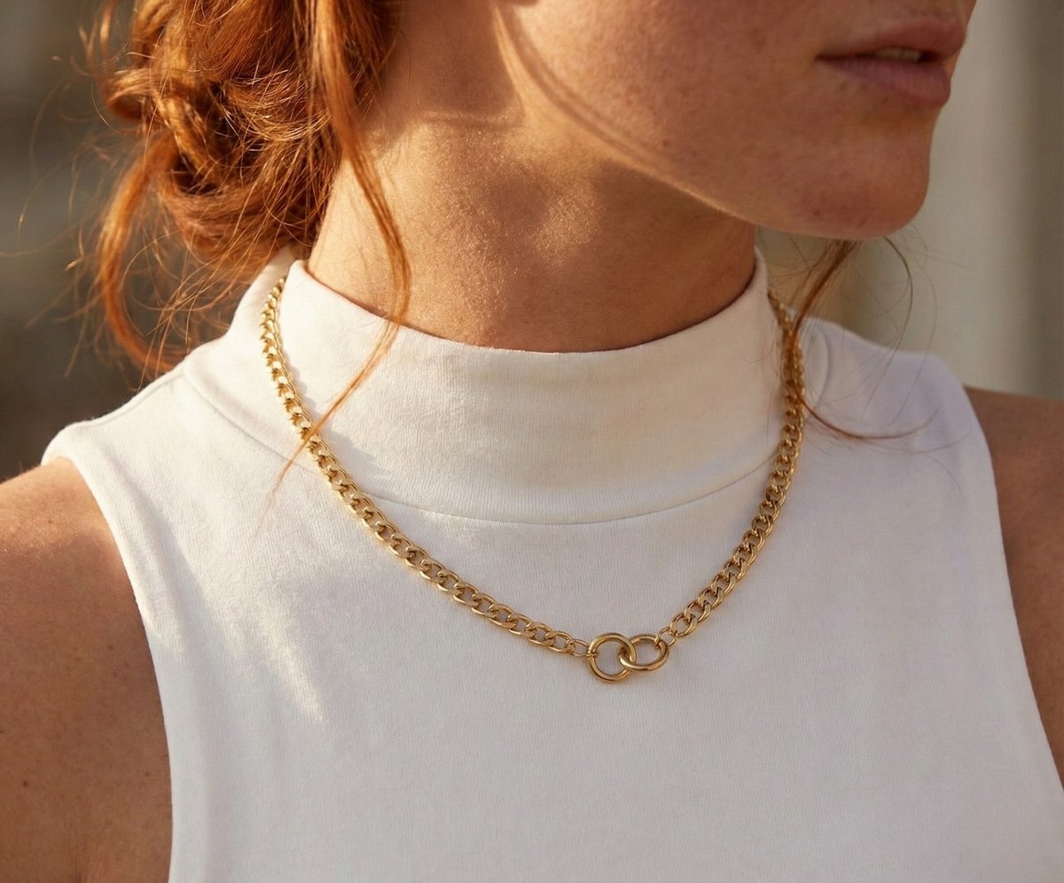 De Lundholm Tilda sleutelbeen ketting is een krachtige, goudkleurige schakelketting met een modern en elegant design. De grove schakels in combinatie met de verbonden ringen in het midden geven deze ketting een stijlvolle en eigentijdse uitstraling. Lees meer