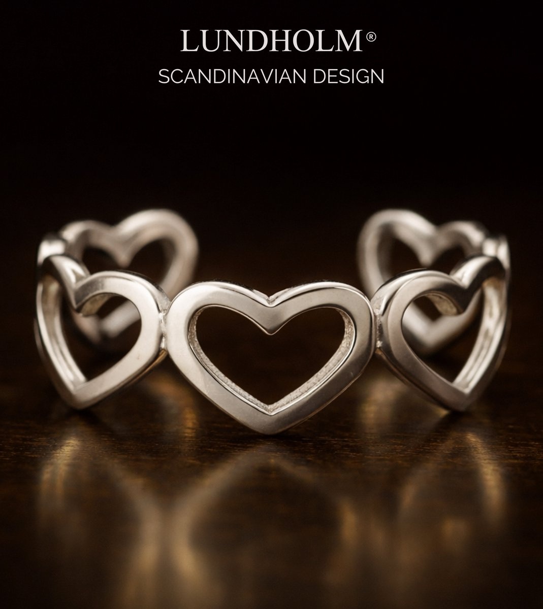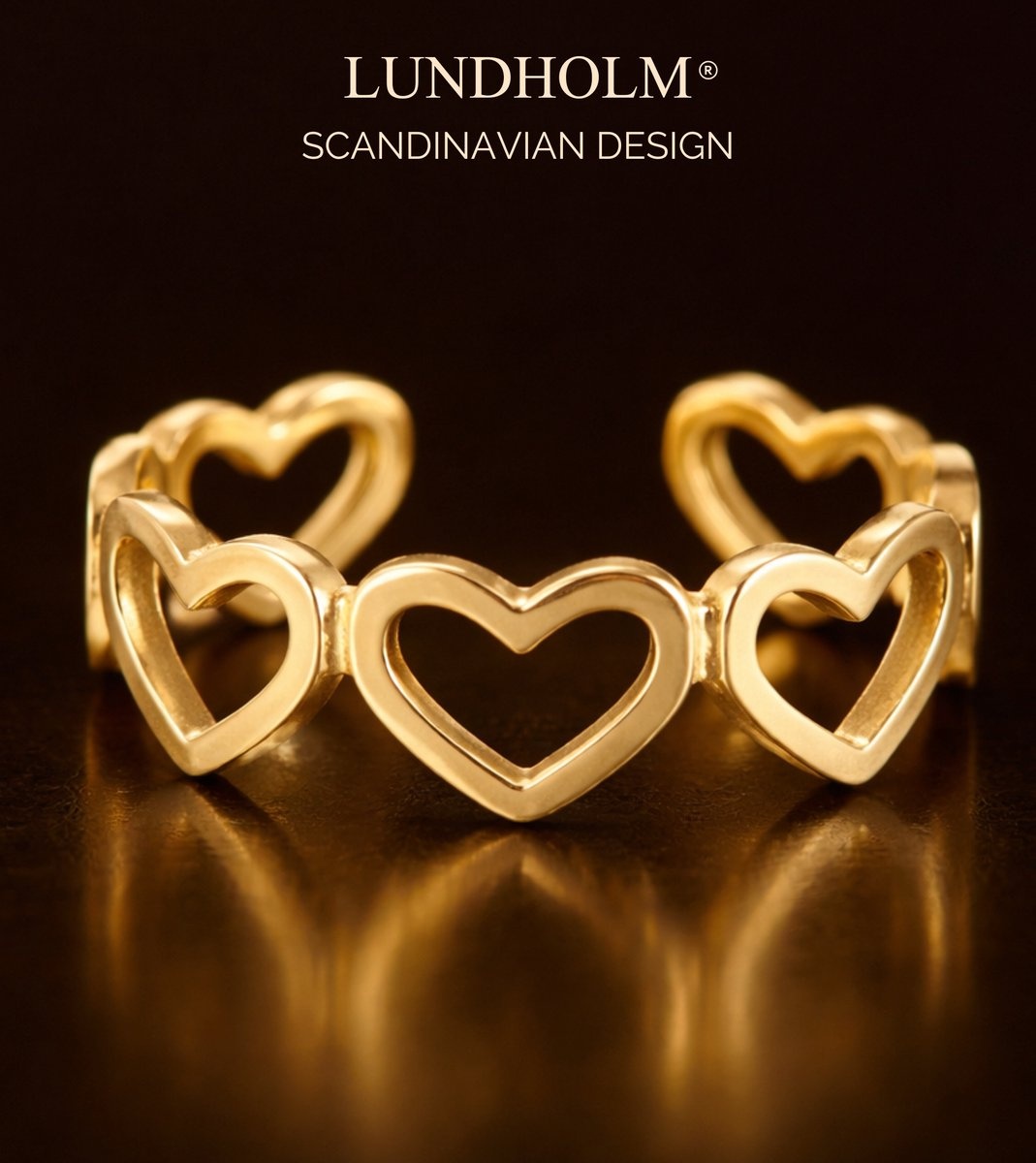 Lundholm Ring Dames – Valentijn Cadeau – Premium Stainless Steel Gold Plated Ring met Verbonden Hartjes – Saksun Serie – One Size – Hypoallergeen & Waterproof – Inclusief Luxe Geschenkverpakking